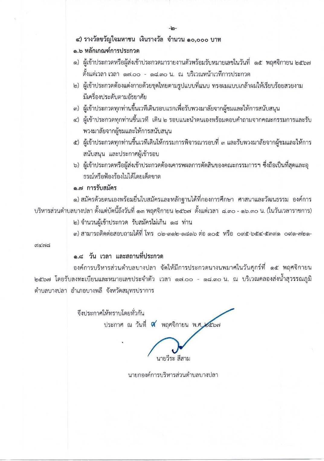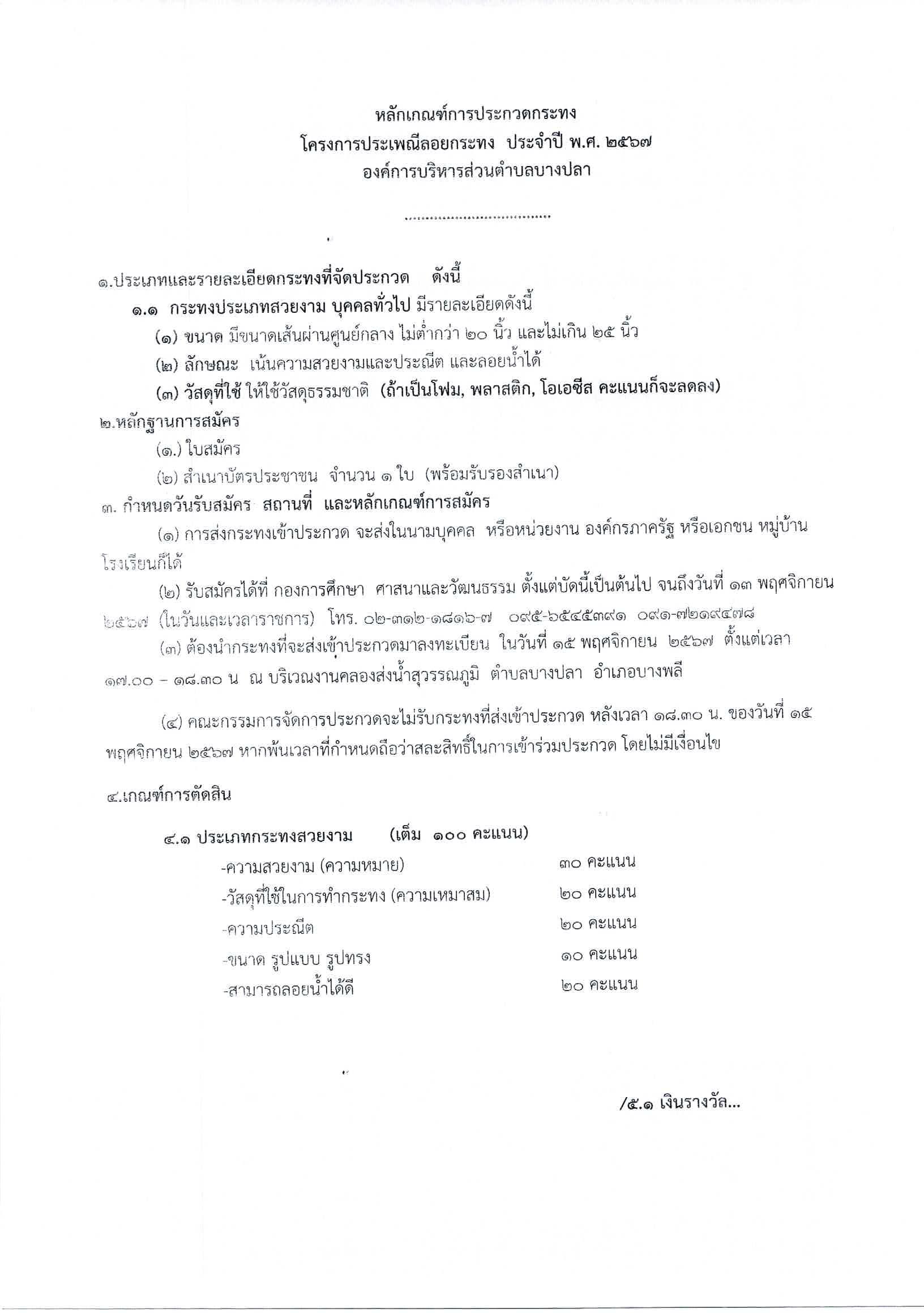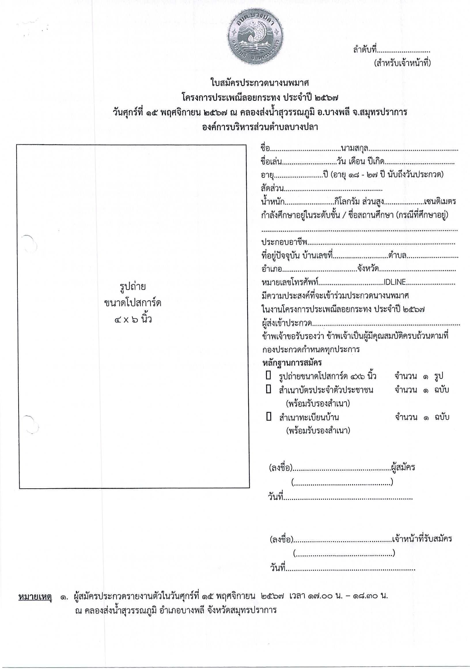 อบต.บางปลา ขอเชิญร่วมงานลอยกระทงยิ่งใหญ่บริเวณคลองส่งน้ำสุวรรณภูมิ ชมการประกวดนางนพมาศและประกวดกระทง และชมกระทงที่ยิ่งใหญ่ที่สุดในการจัดงานลอยกระทงปี 67 นี้