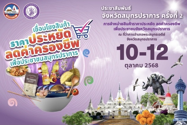 อำเภอพระสมุทรเจดีย์ จัดกิจกรรม “เชื่อมโยงสินค้า ราคาประหยัด ลดค่าครองชีพ เพื่อประชาชนสมุทรปราการ ครั้งที่ 2” ระหว่างวันที่ 10 – 12 ตุลาคม 2568 ณ ที่ว่าการอำเภอพระสมุทรเจดีย์