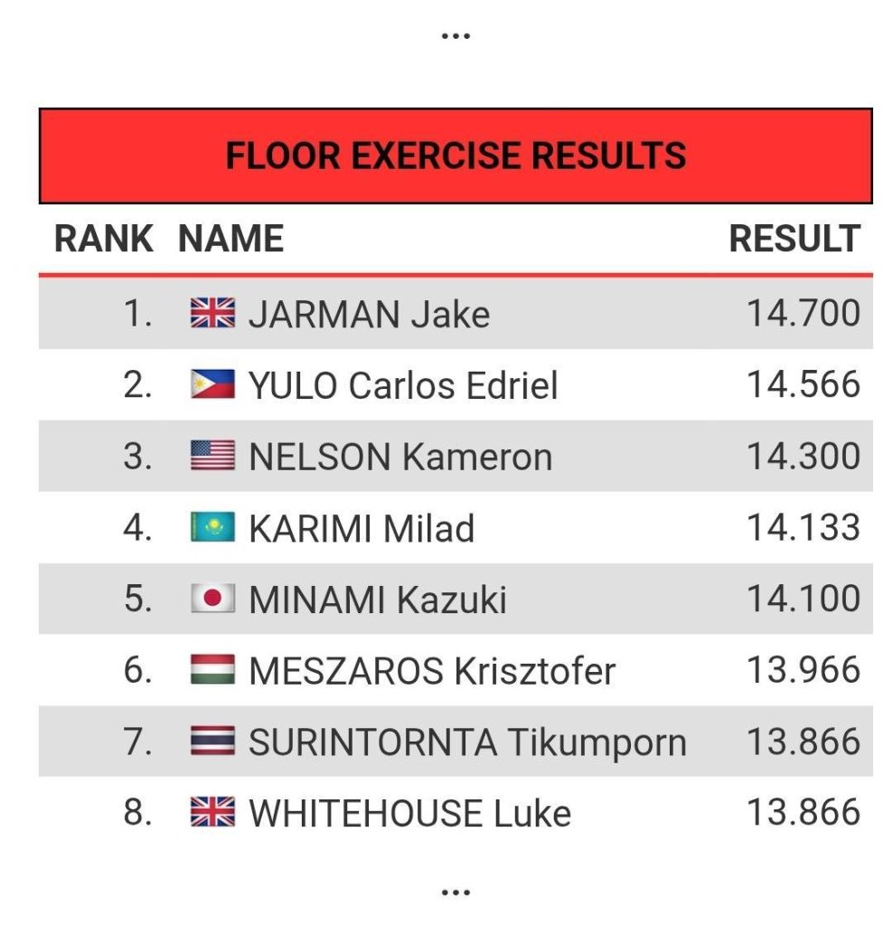 วันแรกของการแข่งขันในประเภทอุปกรณ์ ฟลอร์เอ็กเซอร์ไซส์ (ชาย) มีนักกีฬาจำนวน 122 คน ลงทำการแข่งขัน โดยแบ่งออกเป็น 8 กลุ่ม ซึ่ง “ฑิฆัมพร สุรินทรทะ” หนึ่งเดียวของไทย สามารถทำคะแนนเข้ารอบชิงชนะเลิศ (8 คนสุดท้าย) ได้เป็นผลสำเร็จ ก่อนที่จะจบด้วยอันดับ 7 ทำได้ 13.866 คะแนน ส่วนเหรียญทองตกเป็นของ เจค จามาน (สหราชอาณาจักร) 14.700 คะแนน / อันดับสอง ยูโล่ คาร์ลอส เอเดรียล (ฟิลิปปินส์) เจ้าของเหรียญทองโอลิมปิกเกมส์ครั้งล่าสุด 14.566 คะแนน , อันดับสาม เนลสัน คาเมลอน (สหรัฐฯ) 14.300 คะแนน