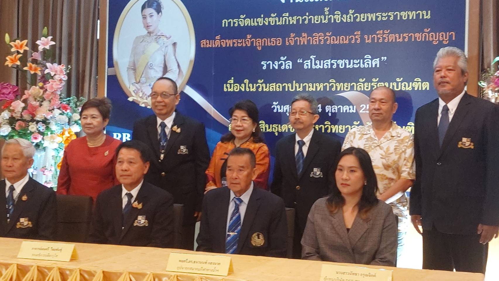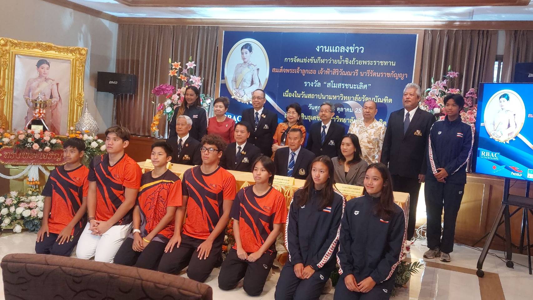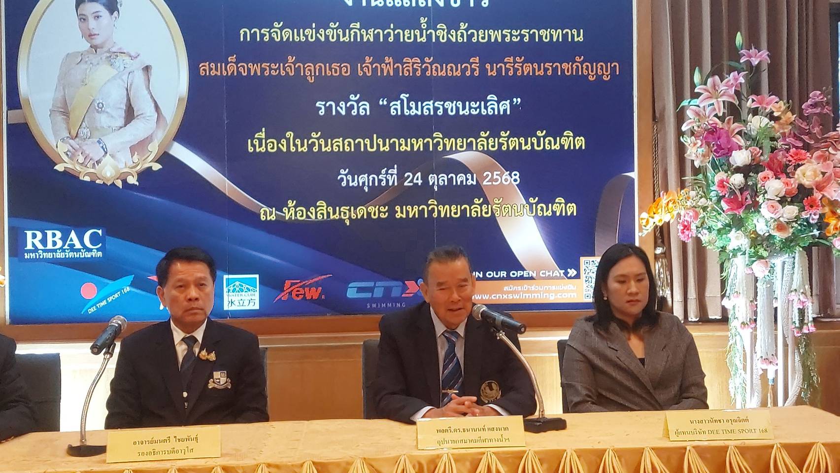 นายมนตรี ไชยพันธ์ รองอธิการบดี อาวุโส มหาวิทยาลัยรัตนบัณฑิต พร้อมด้วย นายศุภนิตย์ วงษาลังการ, พล.ต.ดร.ธนานนท์ แสงนาค อุปนายกสมาคมกีฬาทางน้ำแห่งประเทศไทย และ นางสาว นัทชา อรุณจิตต์ ผู้แทนบริษัท DEE TIME SPORT 168 ร่วมกันแถลงข่าว การแข่งขันกีฬาว่ายน้ำ ชิงถ้วยพระราชทาน สมเด็จพระเจ้าลูกเธอ เจ้าฟ้าสิริวัณณวรี นารีรัตนราชกัญญา “สโมสรชนะเลิศ” เนื่องในวันสถาปนา ครบรอบ 27 ปี มหาวิทยาลัยรัตนบัณฑิต ระหว่าง วันที่ 20-21 ธันวาคม 2568 ณ สระว่ายน้ำรัตนเพียร มหาวิทยาลัยรัตนบัณฑิต (ศูนย์ฝึกกีฬาทีมชาติไทย สมาคมกีฬาทางน้ำแห่งประเทศไทย ) ซอยลาดพร้าว 107