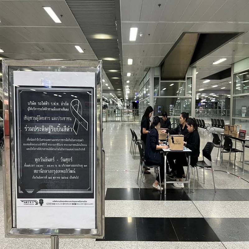 บริษัท รถไฟฟ้า ร.ฟ.ท. จำกัด เชิญชวนผู้โดยสาร และประชาชนทั่วไป ร่วมประดิษฐ์ริบบิ้นสีดำ ถวายความอาลัย และแสดงออกถึงความจงรักภักดีและน้อมรำลึกในพระเมตตา ของสมเด็จพระนางเจ้าสิริกิติ์ พระบรมราชินีนาถ พระบรมราชชนนีพันปีหลวง
