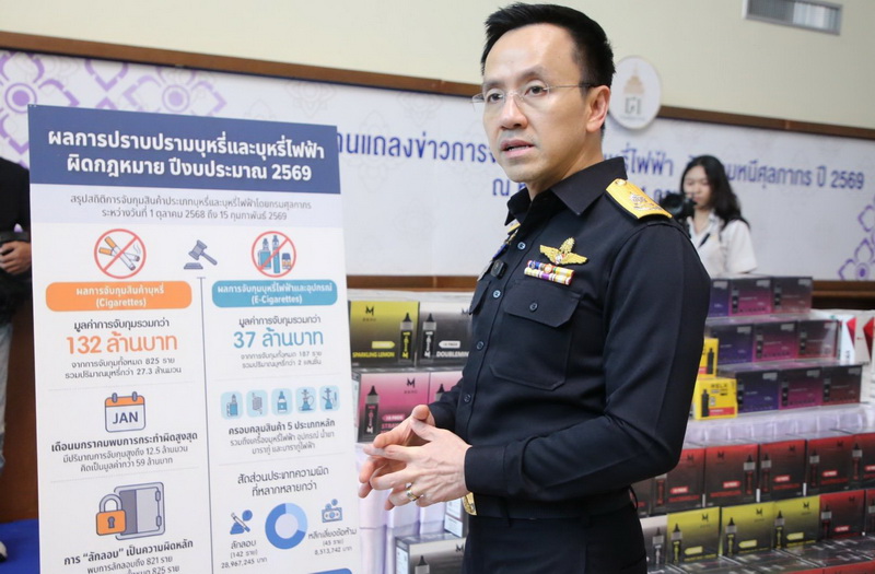 นายพันธ์ทอง ลอยกุลนันท์ อธิบดีกรมศุลกากร เปิดเผยว่า การดำเนินงานดังกล่าวเป็นไปตามนโยบายรัฐบาลในการปราบปรามสินค้าผิดกฎหมายโดยได้สั่งการให้ทุกหน่วยงานบูรณาการความร่วมมือกับหน่วยงานที่เกี่ยวข้องอย่างใกล้ชิด พร้อมเพิ่มความเข้มงวดในการปราบปรามสินค้าผิดกฎหมาย โดยเฉพาะอย่างยิ่งบุหรี่ต่างประเทศและบุหรี่ไฟฟ้า ซึ่งตั้งแต่เดือนตุลาคม 2568 ถึงวันที่ 15 กุมภาพันธ์ 2569 สามารถจับกุมบุหรี่ต่างประเทศรวมกว่า 27.3 ล้านมวน และบุหรี่ไฟฟ้าพร้อมอุปกรณ์กว่า 205,445 ชิ้น คิดเป็นมูลค่ารวม 169,634,923 บาท ซึ่งพฤติการณ์ส่วนใหญ่จะเป็นการลักลอบนำเข้าผ่านทางพัสดุไปรษณีย์ บริษัทขนส่งเอกชน และซุกซ่อนมาในยานพาหนะที่ใช้ในการขนส่ง นอกจากนี้ได้มีการขยายผลโดยบูรณาการร่วมกับกองบัญชาการตำรวจนครบาล สำนักงานคณะกรรมการป้องกันและปราบปรามยาเสพติด และหน่วยงานอื่น ๆ เข้าตรวจค้นและจับกุมในโกดังและสถานที่พักอาศัย โดยมีผลงานจับกุมที่สำคัญดังนี้