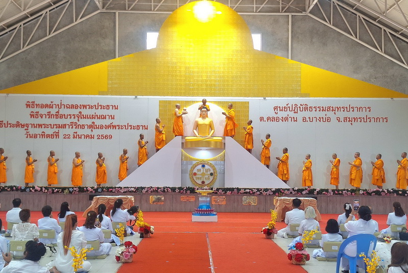 สาธุชนหลั่งไหลร่วมงานบุญทอดผ้าป่าฉลองพระประธาน พิธีจารึกชื่อบรรจุในแผ่นฌาน และพิธีประดิษฐ์ฐานพระบรมสารีริกธาตุในองค์พระประธาน ณ ศูนย์ปฏิบัติธรรมสมุทรปราการ (บางบ่อ)