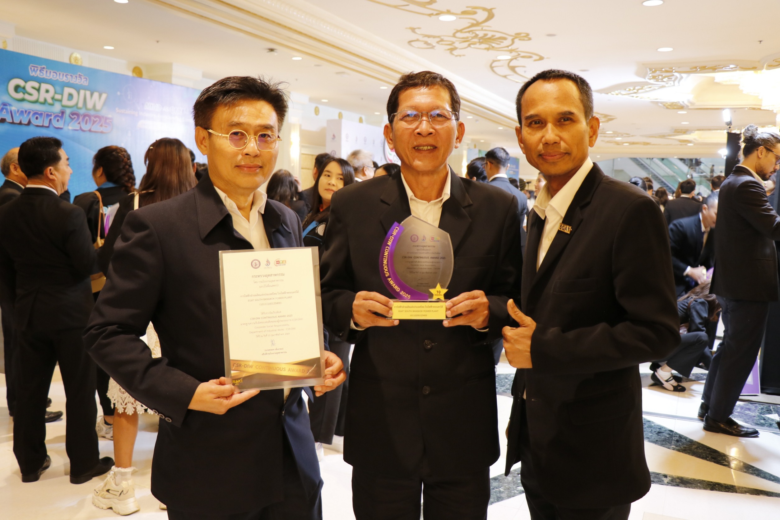 เมื่อวันที่ 25 มีนาคม 2569 ณ ห้องรอยัล จูบิลี่ บอลรูม อาคารชาเลนเจอร์ อิมแพ็ค เมืองทองธานี จังหวัดนนทบุรี นายรังสิต แก้วหวังสกุล ผู้อำนวยการโรงไฟฟ้าพระนครใต้ เป็นตัวแทนองค์กรขึ้นรับรางวัลเกียรติยศ CSR-DIW Continuous Award 2025 ซึ่งเป็นมาตรฐานความรับผิดชอบต่อสังคมของผู้ประกอบการ (Corporate Social Responsibility, Department of Industrial Works: CSR-DIW) โดยได้รับเกียรติจาก ดร.ณัฐพล รังสิตผล ปลัดกระทรวงอุตสาหกรรม เป็นผู้มอบรางวัลในครั้งนี้