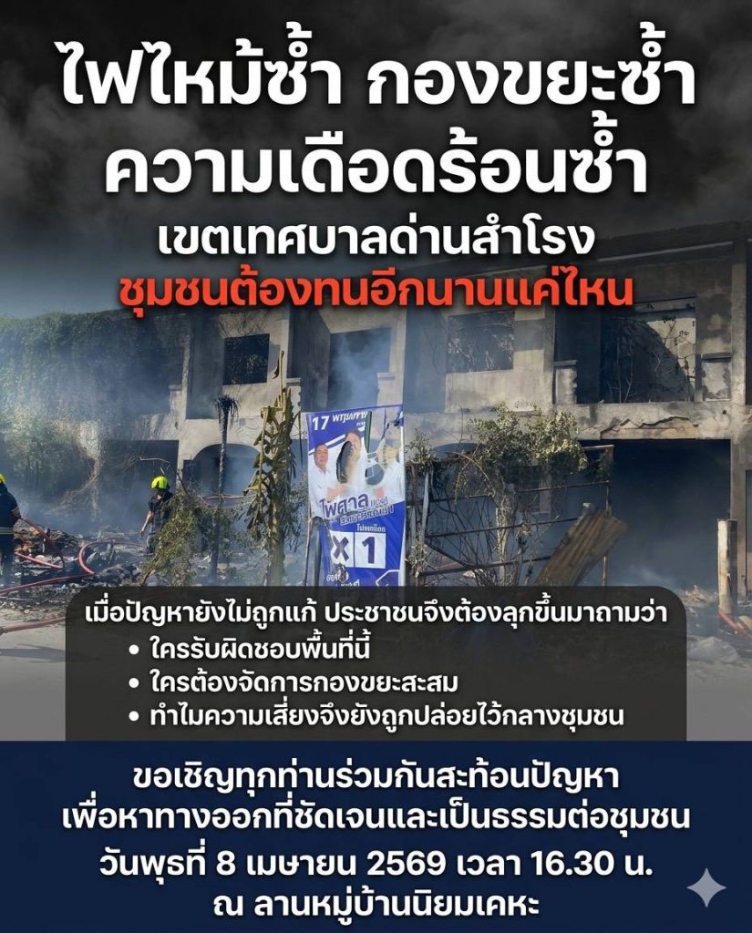 ประชาสัมพันธ์เชิญร่วมประชุมแก้ปัญหาไฟไหม้ตึกร้างกองขยะแห่งนี้ซ้ำฃากหลายครั้ง ในวันพุธที่ 8 เมษายน 2569 นี้