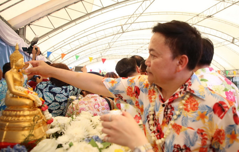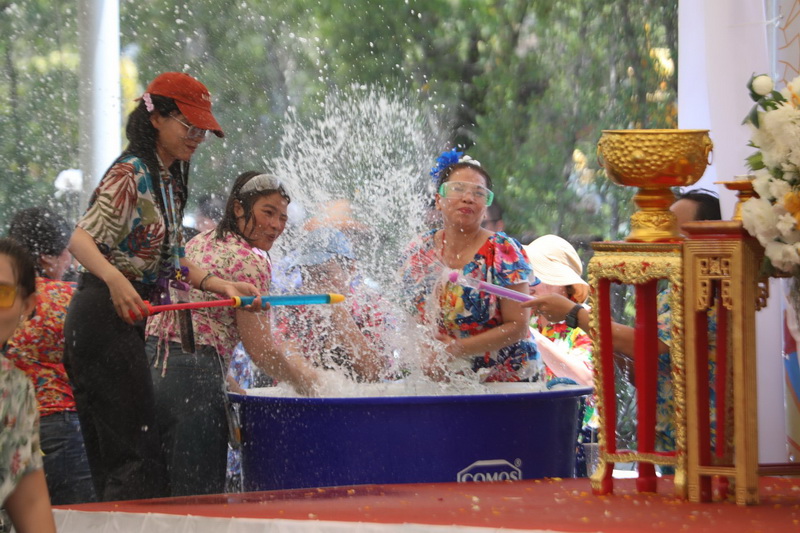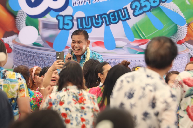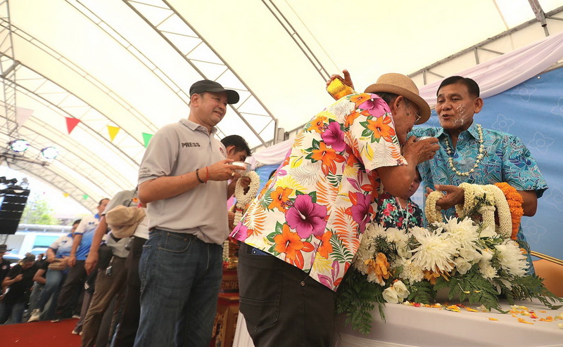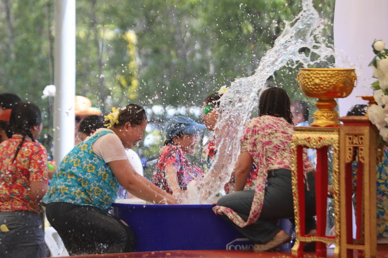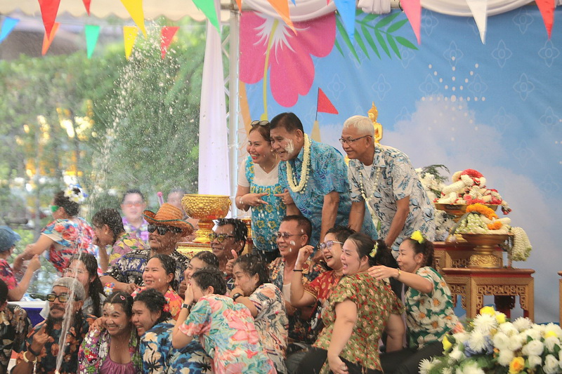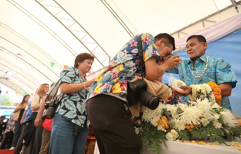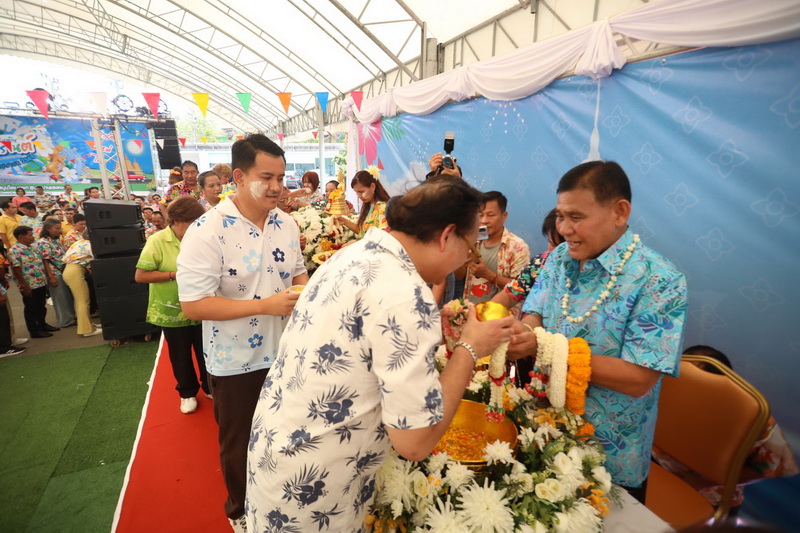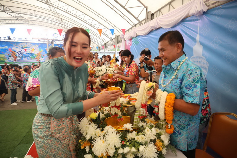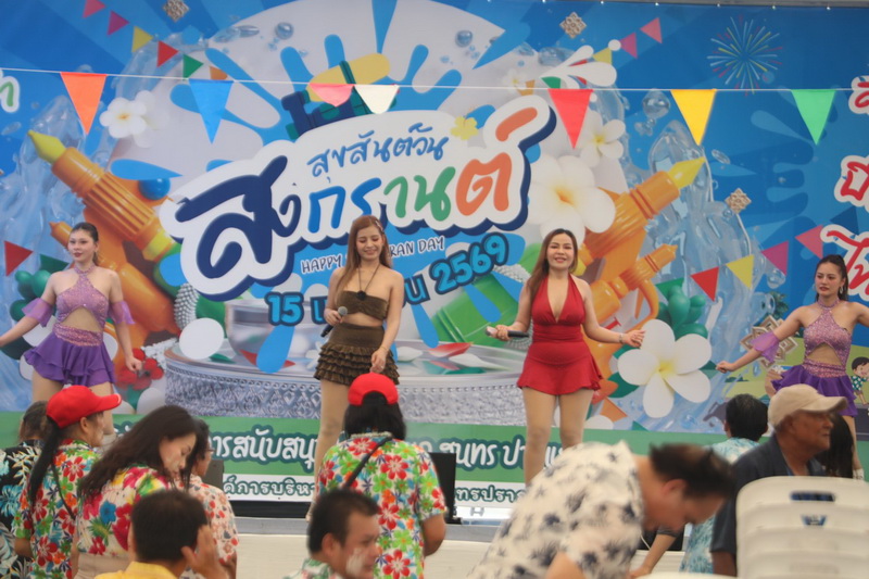 จากนั้น เป็นพิธีรดน้ำดำหัวขอพร จากนายกสุนทร ปานแสงทอง นายกองค์การบริหารส่วนจังหวัดสมุทรปราการ พร้อมนางจันทร์เพ็ญ ปานแสงทอง ภรรยานายก พล.ต.ต.วิชิต บุญชินวุฒิกุล รอง ผบช.ภ.1. พล.ต.ต.ภูมินทร์ สิงหสุต ผู้บังคับการตำรวจภูธรจังหวัดสมุทรปราการ นายสมควร ชูไสว ประธานสภา อบจ.สมุทรปราการ นางสาวสุกัญญา อัศวเหม ประธานสภาเทศบาลนครสมุทรปราการ โดยมีหน่วยงานต่างๆ เข้าร่วมพิธีเป็นจํานวนมาก เพื่อความเป็นสิริมงคลแก่ตนเองและครอบครัว. ต่อนอกจากนั้นแล้วยังร่วมร้องเพลงเต้นรำและเล่นน้ำสงกรานต์กันอย่างสนุกสนาน ในวันสุดท้ายของเทศกาลสงกรานต์